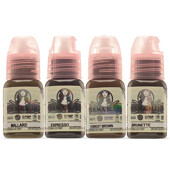 Набор включает универсальный тон Brunette, который идеально заживает на зеленом типе кожи. В прочих случаях его нужно миксовать с разбавителем и использовать поверхностно. Второй тон - Espresso является миксом красного и желтого тонов, который красиво заживает ровным коричневым цветом. Третий тон Forest Brown - русо-коричневый цвет, подходящий для плотной или прозрачной забивки. Средне-насыщенный цвет Mallard отлично подойдет для нордического типа внешности. Для хорошего сочетания тона с русыми волосами целесообразно затеплить краску другими пигментами.